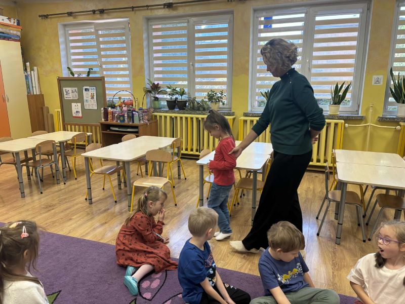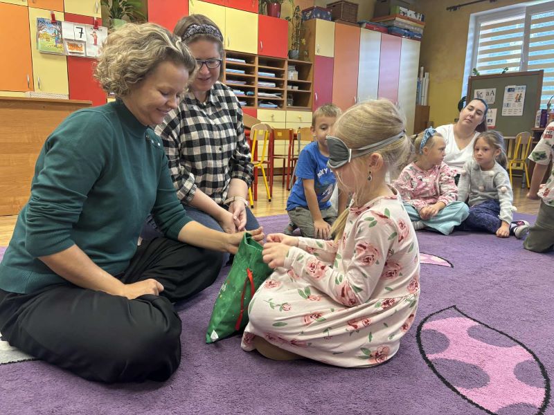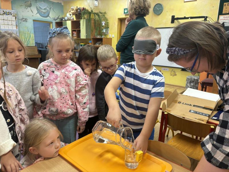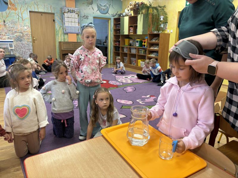 Dzieci dowiedziały się również, że osoby niewidome potrafią wykonywać wiele czynności samodzielnie – nalewać wodę do szklanki, rozpoznawać kolory, mierzyć temperaturę. Przedszkolaki z zaciekawieniem próbowały swoich sił w podobnych zadaniach, przekonując się, że nie widząc, można „widzieć” inaczej.
