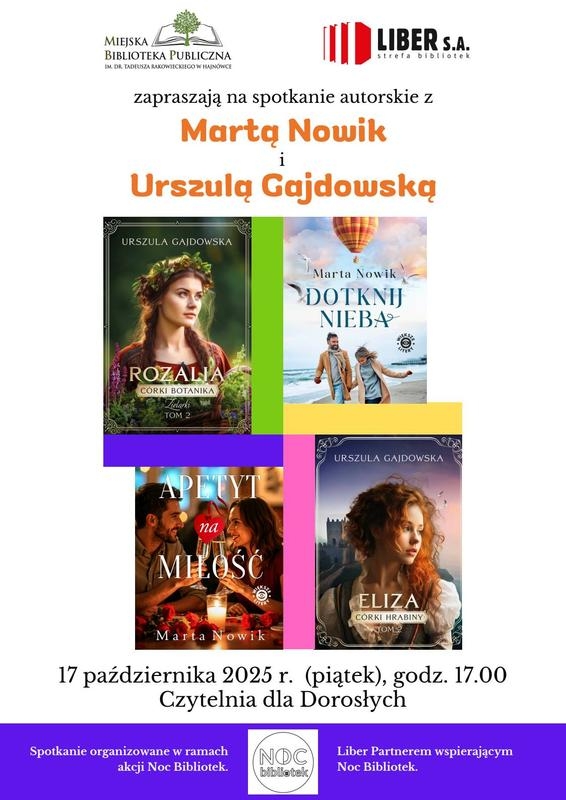 Miejska Biblioteka Publiczna im. dr. Tadeusza Rakowieckiego oraz Liber S.A. Strefa Bibliotek zapraszają na spotkanie z Martą Nowik i Urszulą Gajdowską - autorkami powieści obyczajowych i historycznych.
