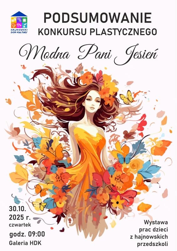 Data wydarzenia czw., 30/10/2025 - 09:00 - czw., 30/10/2025 - 11:00 Kategoria Wydarzenia miejskie Hajnowski Dom Kultury zaprasza na podsumowanie konkursu plastycznego „Modna Pani Jesień” 30 października (czwartek) godz. 09:00 Wystawa prac dzieci z hajnowskich przedszkoli. Wstęp wolny DrukujPDF