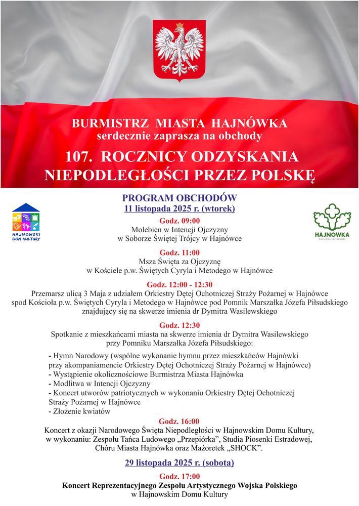 Burmistrz Miasta Hajnówka zaprasza na obchody 107 Rocznicy Odzyskania Niepodległości przez Polskę.