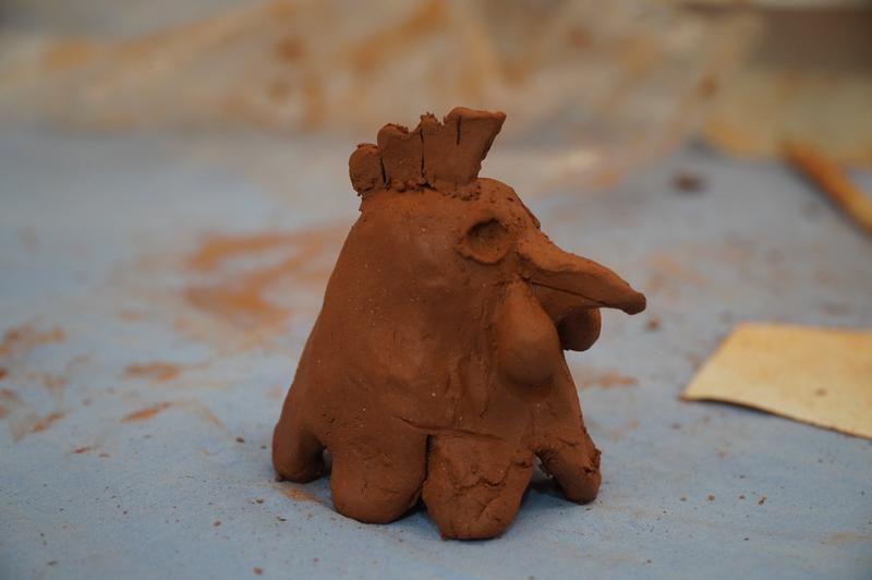 Uczestnicy pracowali z naturalną gliną, budując bryłę krok po kroku – najpierw ciało, potem głowę i charakterystyczne elementy: grzebień, skrzydła, ogon. Inspiracją była rzeźba ludowa oraz dawne ceramiczne zabawki, w których najważniejsza była nie dosłowność, lecz opowieść i emocja.